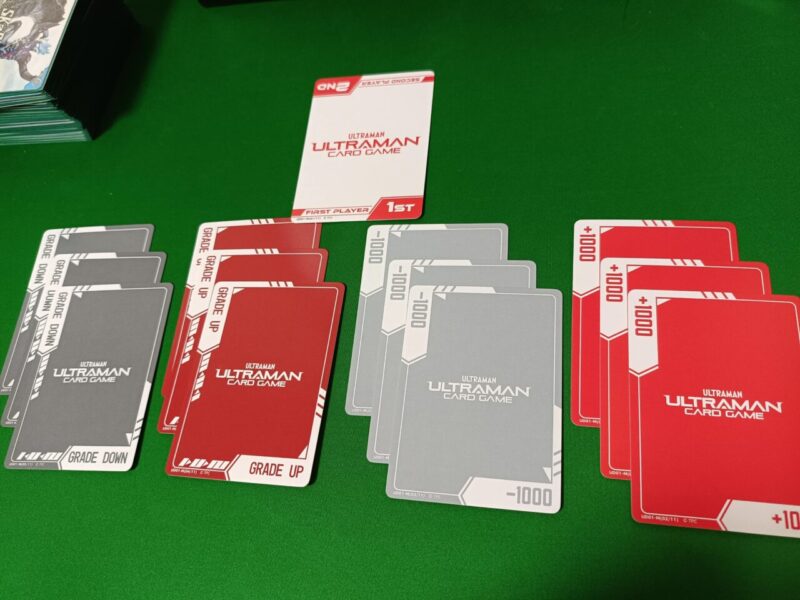 ウルトラマンカードゲームの場合、公式マーカーがウルトラデッキに含まれているので持っていなければ買っておくととっても便利。先手後手、BPプラスマイナス、グレードアップダウンと一通り用意されている。